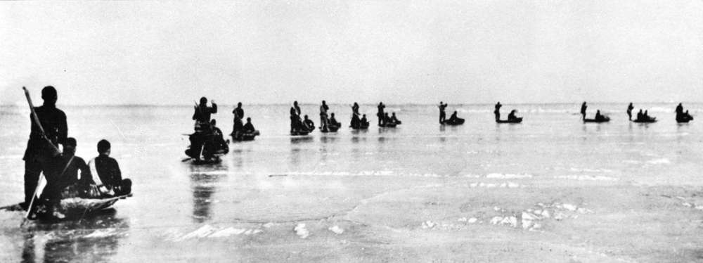 冬天的白洋淀是雁翎队活动的大好时光,他们驾着冰床轻快地往来战斗,滑行在银色的冰淀上。(1944年摄)石少华摄(新华社稿)