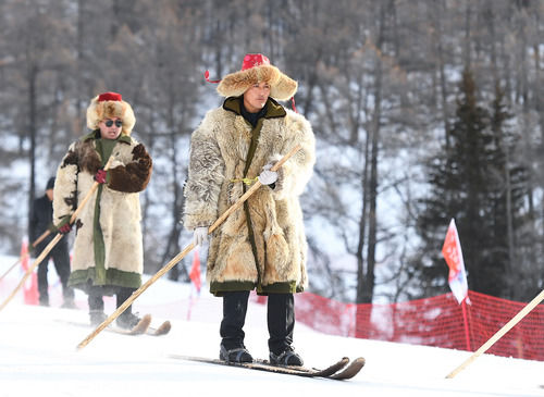 2019年12月15日,当地居民表演毛皮滑雪。阿勒泰地区被称为“人类滑雪起源地”,当地居民使用的毛皮滑雪板被视为最古老的滑雪板之一。新华社记者宋彦桦摄