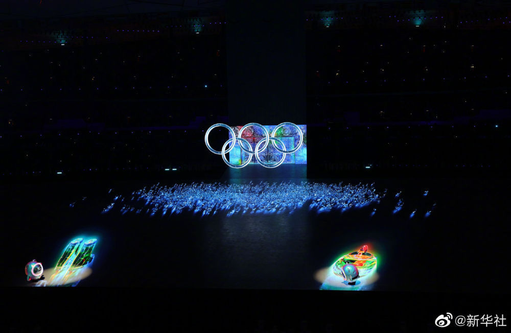 4日晚,北京冬奥会开幕式上演绎《冰雪五环》。一滴水变成冰。一滴冰蓝色的水墨从天而降,幻化为黄河之水,倾泻而下。整个画面的意境,来自中国古老的诗句“黄河之水天上来”,这是对中国母亲河的浪漫想象和赞美。翻腾的浪涛最终凝结为一片晶莹剔透的冰雪天地,也好像是凝固了时光。
