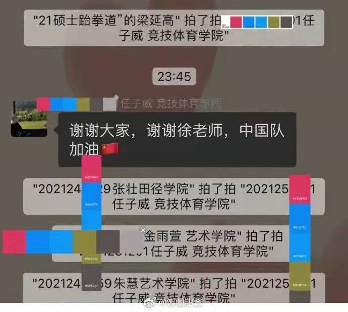 据悉,任子威是北京体育大学研究生冠军班2021级的新生。作为冠军之一的他昨晚赛后在微信群里还心系作业,忙着找课代表交作业,之后被老师”无情”移出群聊。