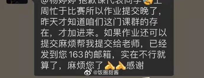 任子威在群里发消息并艾特课代表:“抱歉课代表同学,上周忙于比赛所以作业提交晚了。昨天才知道咱们这门课群的存在,才加进来。如果作业还可以提交麻烦帮我提交给老师,已经发到您163邮箱了,实在不行就算了,麻烦您了,感谢。”