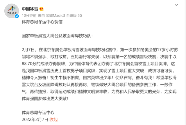 在刚刚结束的北京冬奥会单板滑雪男子坡面障碍技巧决赛中,首次亮相冬奥赛场的17岁中国小将苏翊鸣获得银牌,创造历史,收获了中国体育代表团参加冬奥会历史上的首枚单板滑雪奖牌。体育总局冬运中心发贺信祝贺,贺信如下: