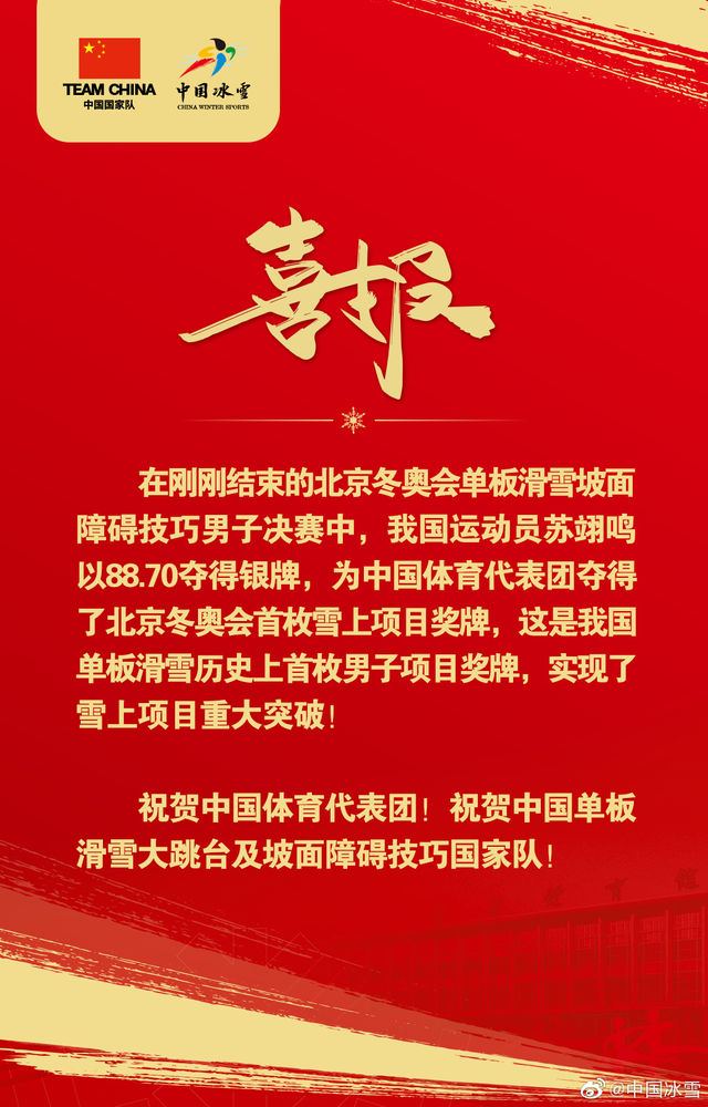 2月7日,在北京冬奥会单板滑雪坡面障碍技巧比赛中,第一次参加冬奥会的17岁小将苏翊鸣不惧强手、敢打敢拼,五轮滑行零失误,以预赛第一名的成绩晋级决赛,决赛中以88.70分的成绩夺得银牌,为中国体育代表团夺得了北京冬奥会首枚雪上项目奖牌,这是我国单板滑雪历史上首枚男子项目奖牌,实现了雪上项目重大突破!成绩可喜可贺,精神令人振奋!初生牛犊不怕虎,自古英雄出少年!使命在肩,奋斗有我!希望单板滑雪大跳台及坡面障碍技巧队再接再厉,继续做好大跳台项目的备赛参赛工作,一鼓作气、再传捷报,取得运动成绩和精神文明双丰收,为党和人民争取更大的光荣,为实现体育强国梦做出更大贡献!