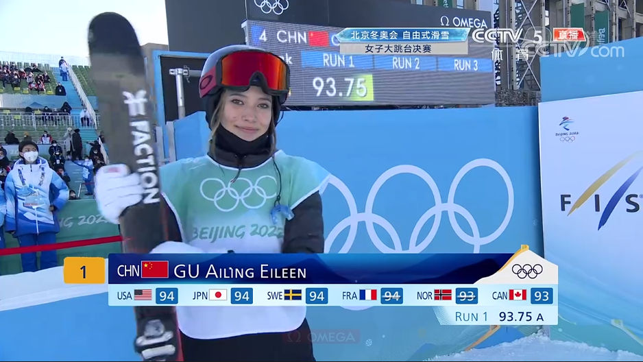 刚刚,谷爱凌正式出战自由式滑雪女子大跳台决赛。这是她在北京冬奥第一个决赛!她的第一跳得分93.75!全场最高!