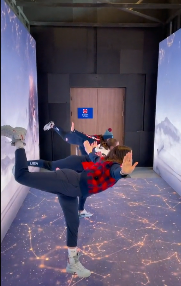 赛场外,以大熊猫为原型的吉祥物“冰墩墩”毫无疑问是奥运村“朋友圈”中“顶流”。美国运动员玛迪·马斯特罗自抵达北京以来在TikTok上发布了几十条视频,很多都与“冰墩墩”有关。其中最“火”的一条是她在“粉丝”提醒下,发现带有“冰墩墩”图案的靠枕竟然能展开变成一张毯子。“太天才了!”她惊奇地说。视频浏览量已超过630万。这个美国姑娘还分享了自己在奥运村户外遛弯时“偶遇”“冰墩墩”、在房间里发现老虎毛绒玩具等经历。