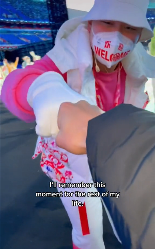 德国运动员在北京冬奥会开幕式上与工作人员“碰拳”(网络视频截屏)