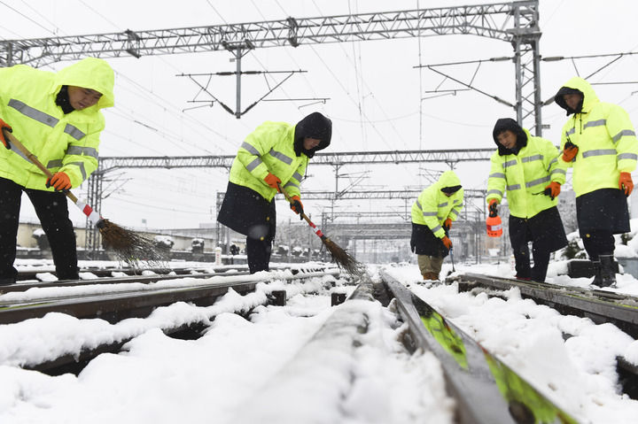 2月7日,合肥站工作人员在清扫道岔积雪。新华社记者周牧 摄