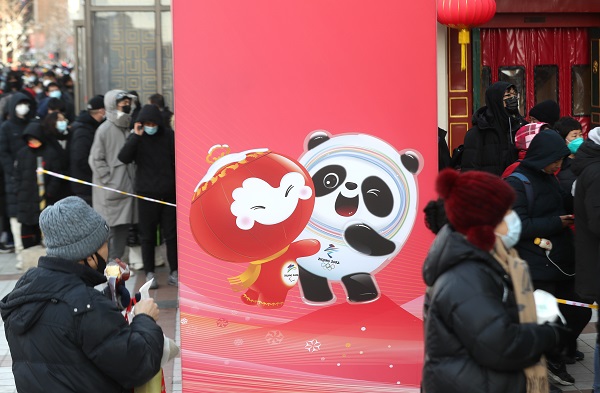 2月7日,北京王府井工美大厦门外,顾客排队购买北京2022官方特许商品。中国日报记者 邹红摄