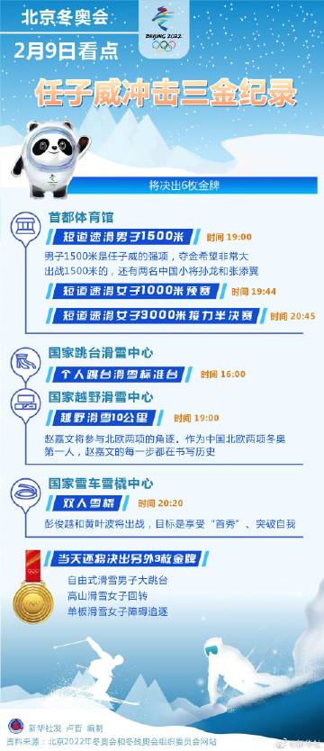 【#北京冬奥会9日看点# #任子威冲击三金纪录#】#北京冬奥会9日将决出6枚金牌#,中国观众极为关注的短道速滑项目将产生男子1500米金牌,已经两金在手的任子威有望收获第三金,追平中国选手单届冬奥会夺金纪录。