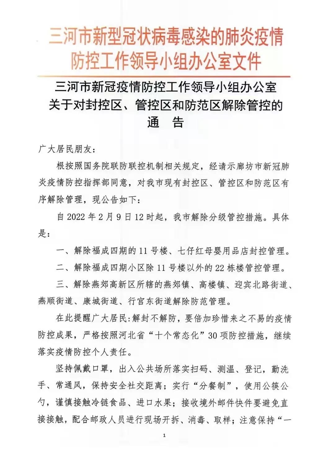 据“网信三河”微信公众号消息,2月9日,河北三河市新冠疫情防控工作领导小组办公室,发布关于对封控区、管控区和防范区解除管控的通告。