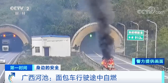 监控视频显示,当天早上7点48分,一辆银色面包车行驶过程中发生自燃,驾驶员及乘客下车查看情况并离开现场,面包车开始燃烧冒出滚滚浓烟,不一会,着起熊熊烈火。河池高速交警和消防员接到警情后立即赶到现场,发现整个辆车已经烧得仅剩一个空壳。