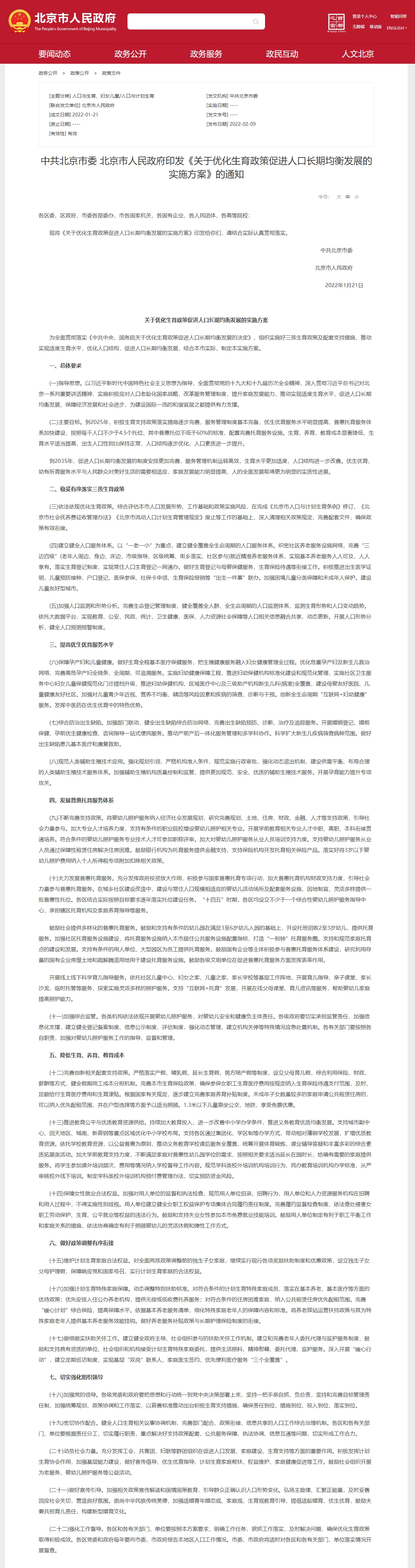 据北京市人民政府“首都之窗”网站消息,北京市人民政府2月9日发布《关于优化生育政策促进人口长期均衡发展的实施方案》。其中提到,推进教育公平与优质教育资源供给。