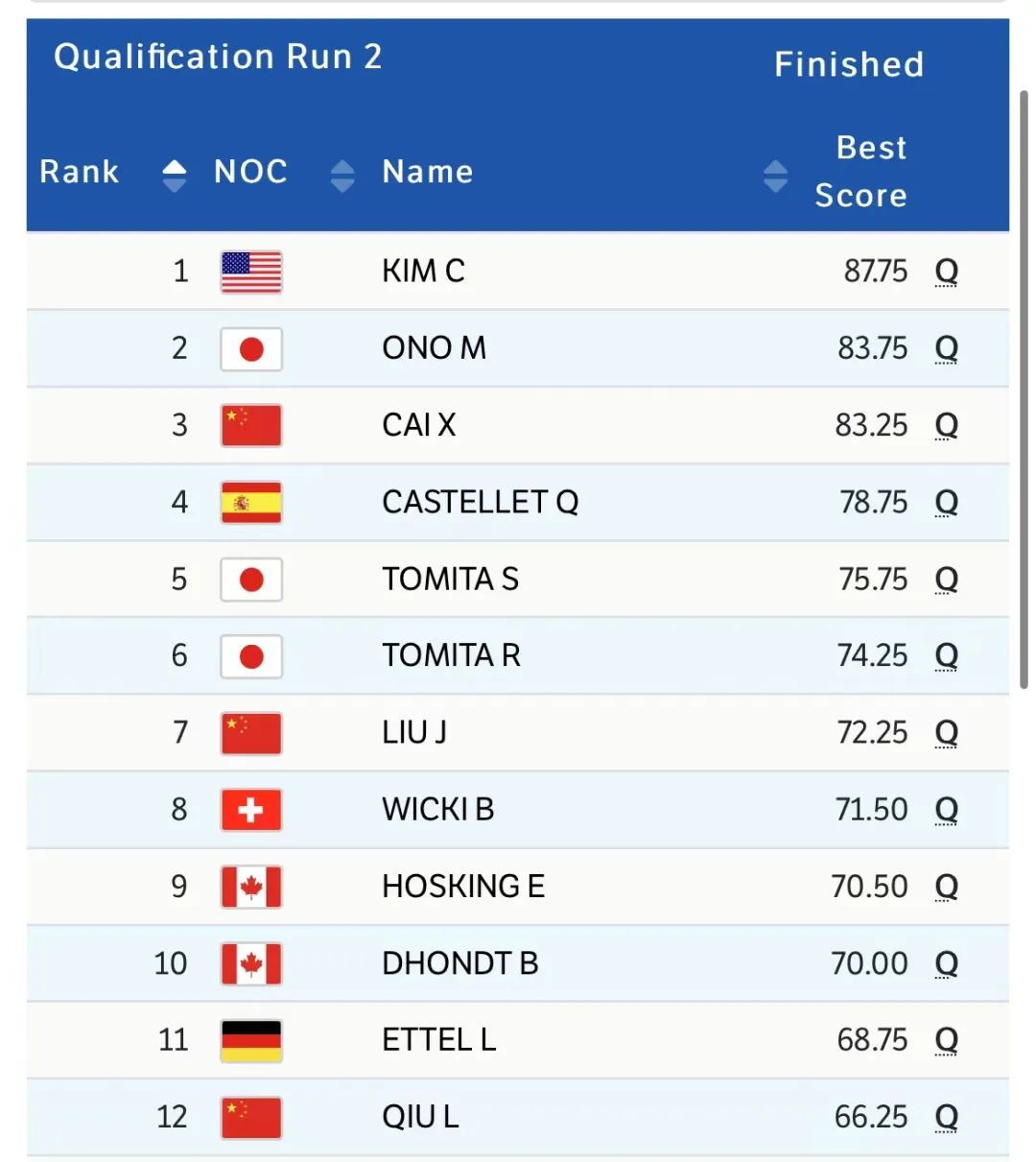 中国队在冬奥会上的最好成绩是刘佳宇在平昌冬奥会获得的银牌,实现了中国在该项目冬奥会奖牌零的突破。在今天的首轮比赛中,刘佳宇第一个出发,比赛中她正反脚接连完成了720度的转体,然而在做一个反脚的动作时没有控制好重心,摔倒在赛场,结果得到了15.25分。第二轮,她扛住首轮失误的巨大压力,贡献了一套完成度很高的动作,完成逆转。