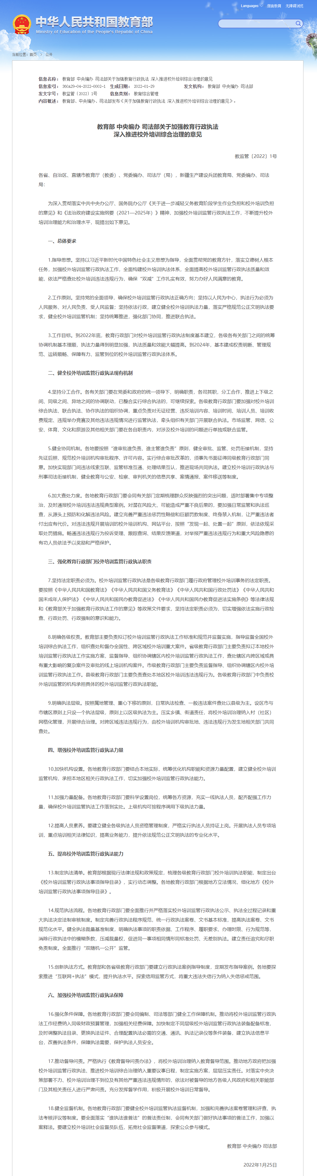 据教育部网站消息,近日,为深入贯彻落实中共中央办公厅、国务院办公厅《关于进一步减轻义务教育阶段学生作业负担和校外培训负担的意见》精神,教育部、中央编办、司法部联合印发了《关于加强教育行政执法 深入推进校外培训综合治理的意见》(以下简称《意见》)。