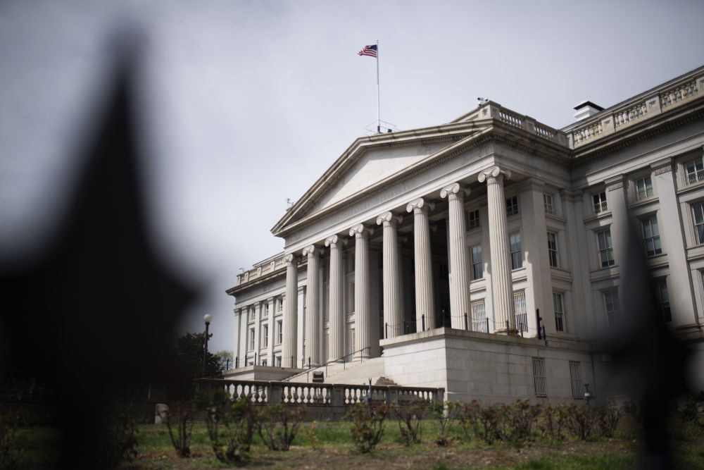 这是2020年3月27日在美国首都华盛顿拍摄的美国财政部大楼。(新华社记者刘杰摄)