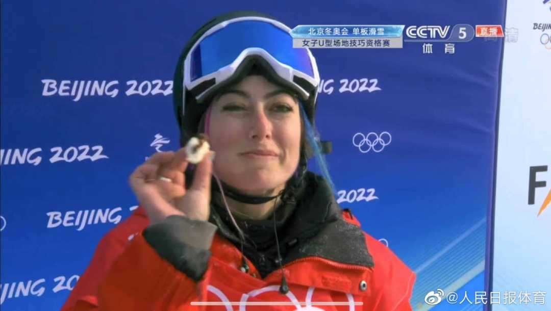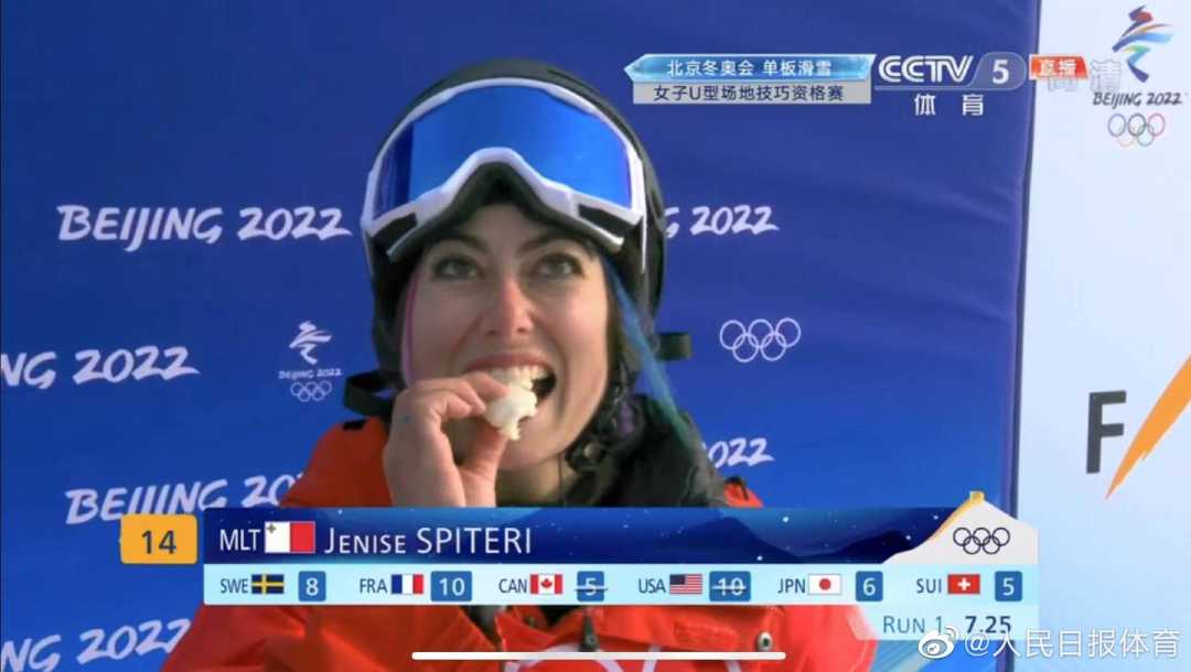 在2月9日上午进行的北京冬奥会单板滑雪女子U型场地技巧资格赛中,马耳他队唯一参赛选手珍妮丝第一轮滑行不慎摔倒。在等待分数的时候,她从口袋里掏出半个包子,对着镜头咬了一口。原来,这是冬奥村里她最爱吃的豆包,她说,希望用一点甜蜜来缓解因摔倒带来的沮丧。尽管最后止步半决赛,但珍妮丝依然用自信乐观征服了现场的观众和媒体。