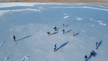 2022年1月16日,西宁市成人业余冰球队在青海湖打冰球。队员乔金磊供图