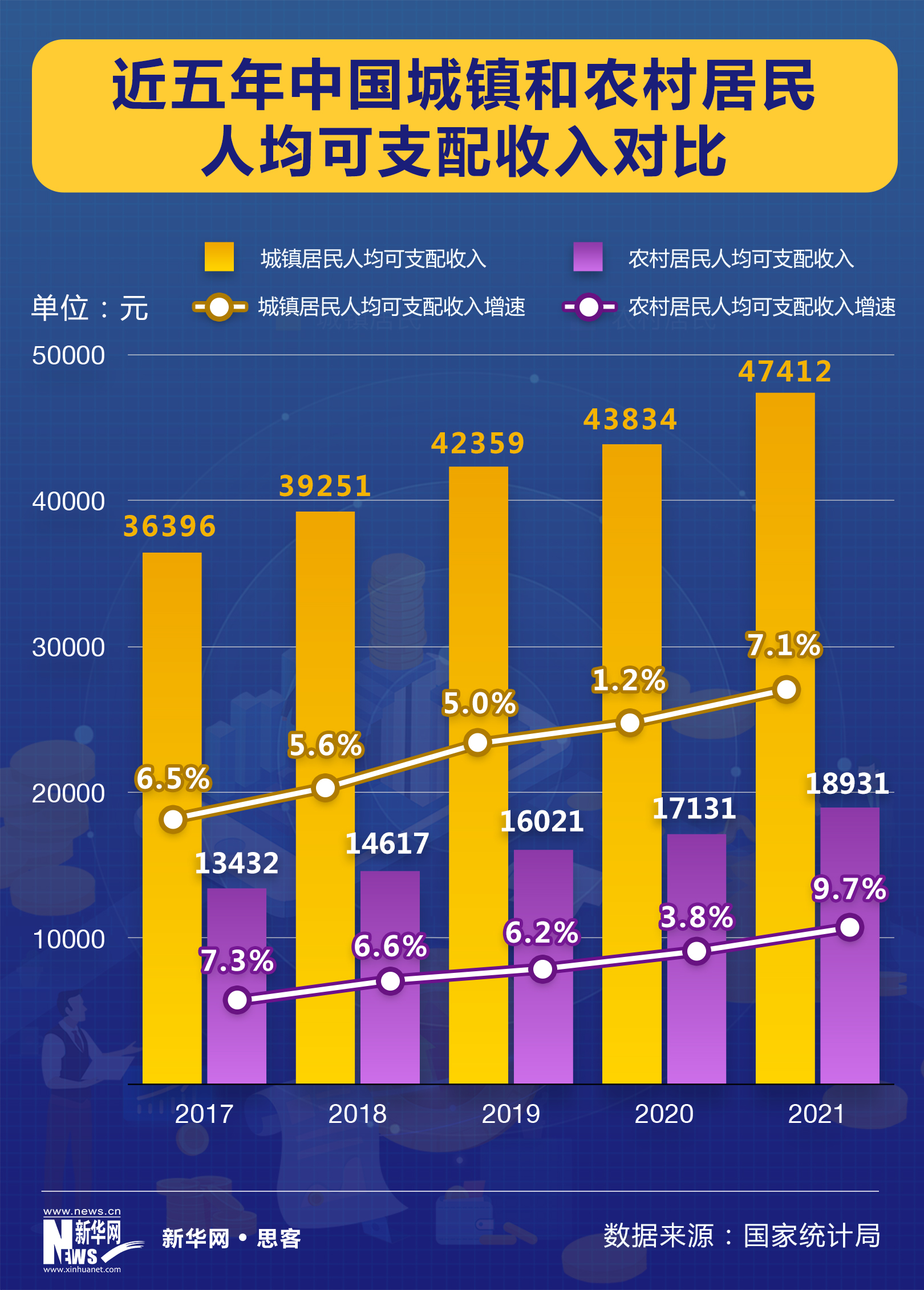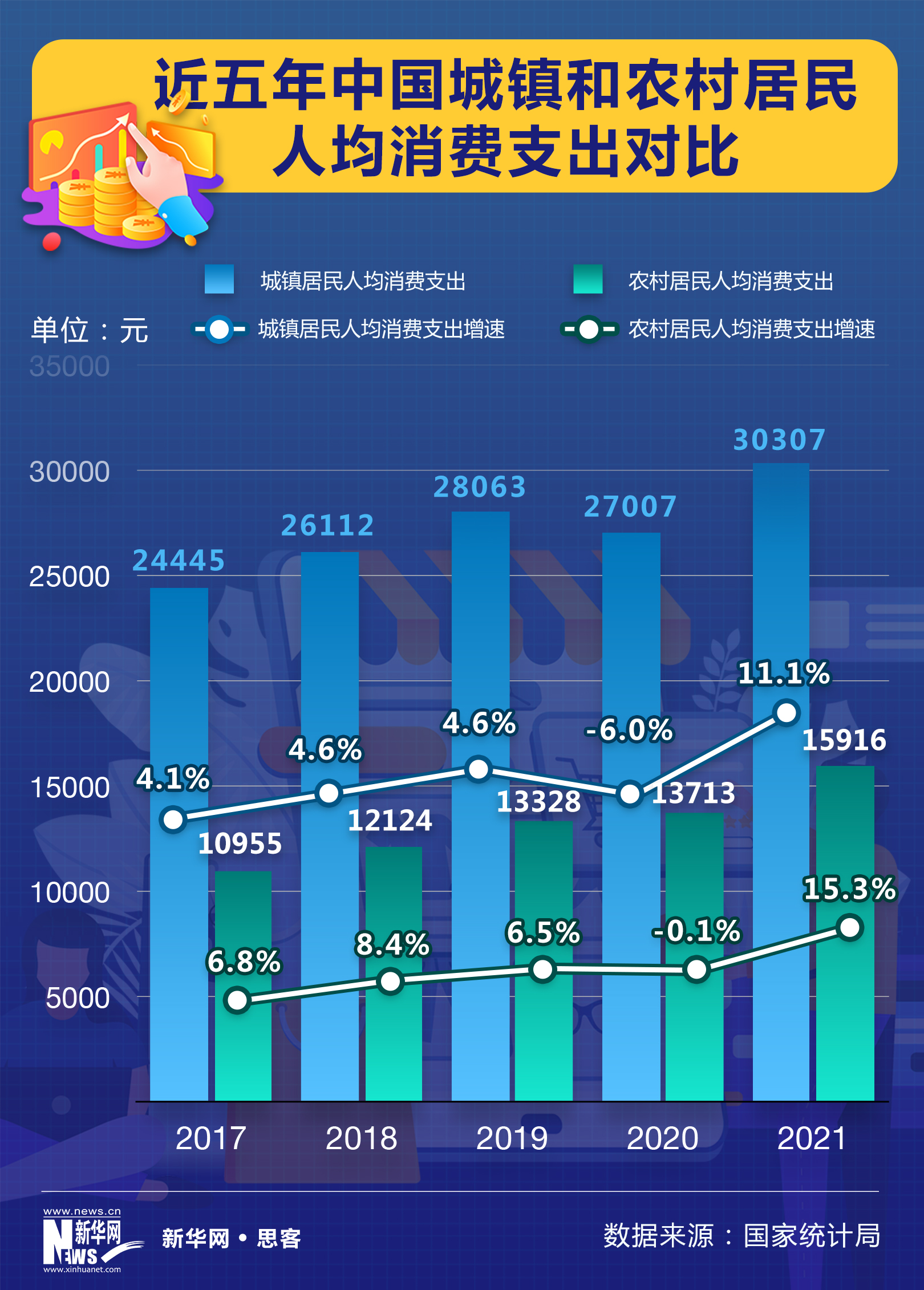 如今乡村年货越来越丰富,乡亲们的消费观念也在变。国家统计局贸易外经统计司司长董利华分析,中国脱贫攻坚取得全面胜利,带动了农村居民消费能力提升和农村地区消费环境改善。这从2021年城镇和农村居民人均消费支出对比可以看出来,2021年农村居民人均消费支出15916元,名义增长16.1%,扣除价格因素,实际增长15.3%。农村居民人均消费支出增速恢复程度好于城镇居民,名义增速和实际增速分别快于城镇居民3.9和4.2个百分点。