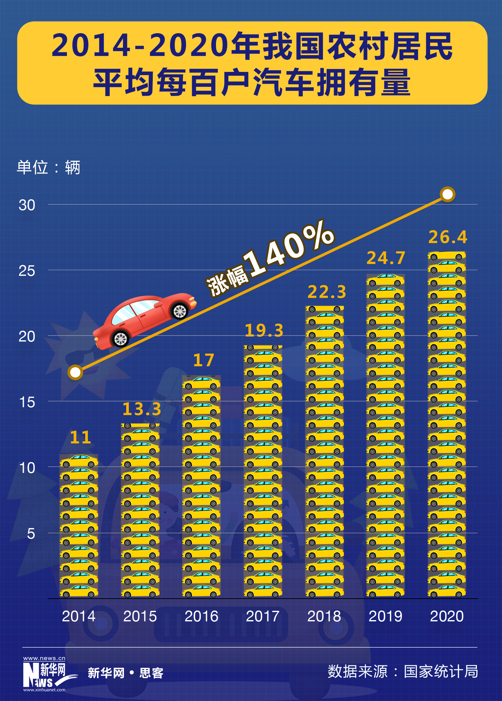 近年来,随着乡村振兴和村村通公路政策的实施,农村居民收入和生活水平提高,农村道路条件得到较大提升,农村汽车消费正在进入爆发增长的阶段。这一点,从2014-2020年我国农村居民平均每百户汽车拥有量可以看出来,2020年农村居民平均每百户汽车拥有量为26.4辆,比2014年增加15.4辆,增长140%,在农村居民耐用消费品拥有量中增长速度最快。