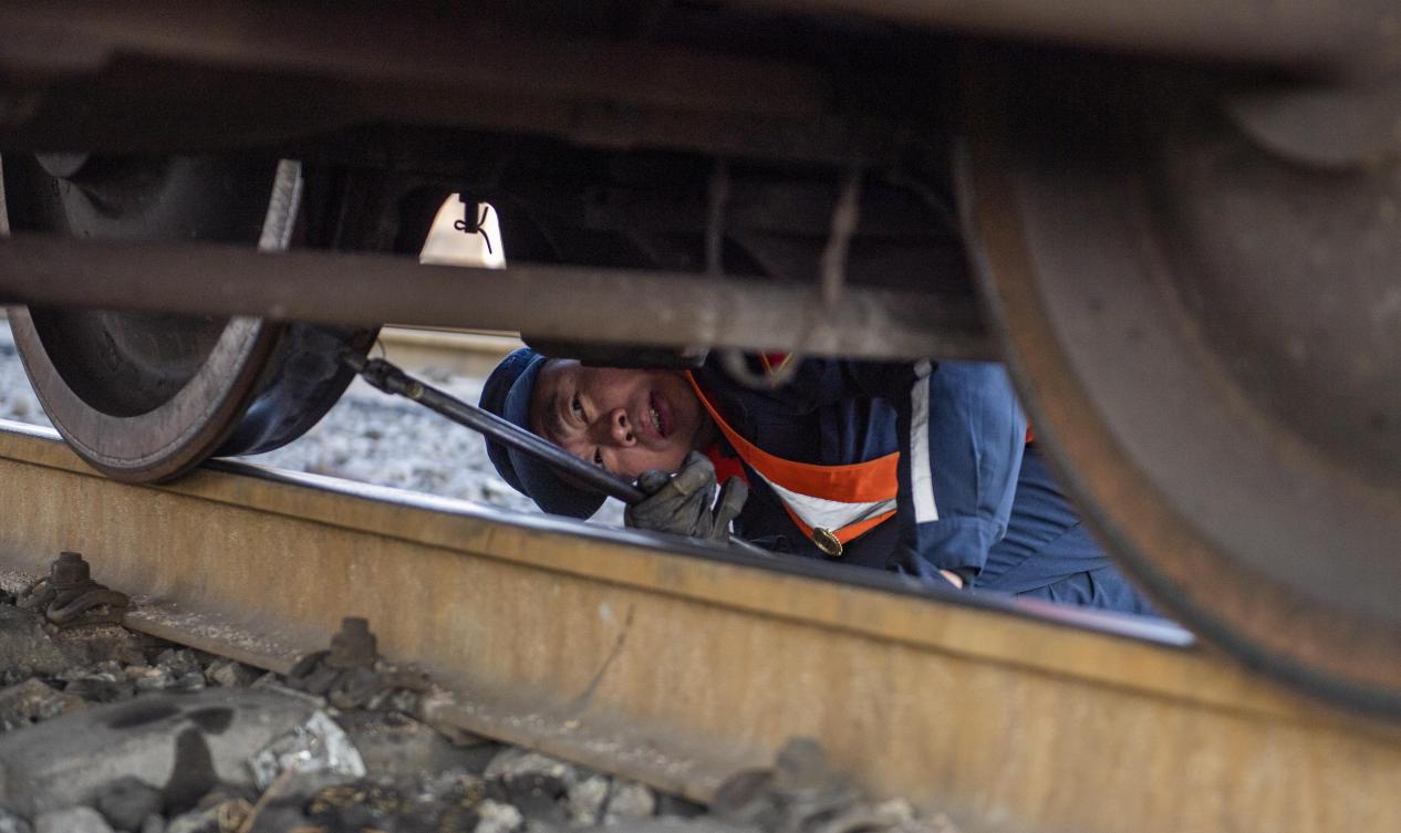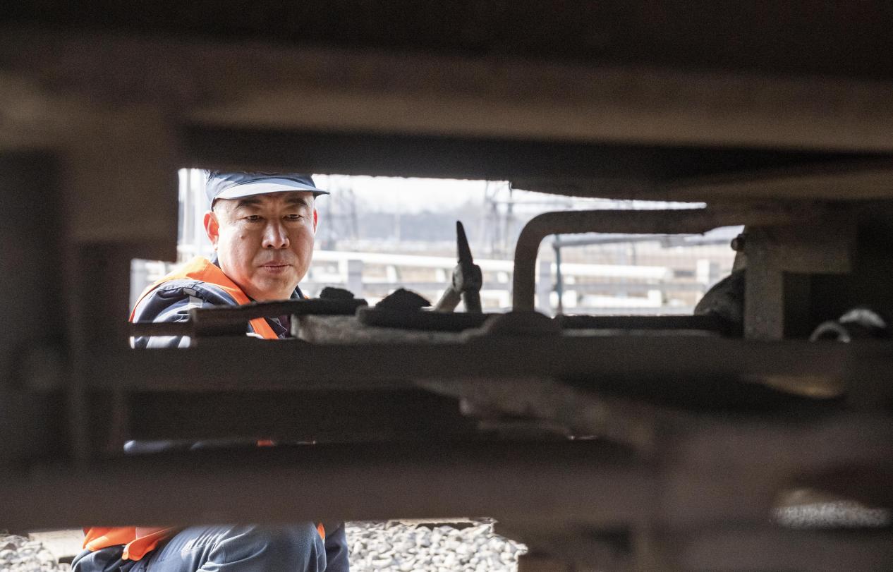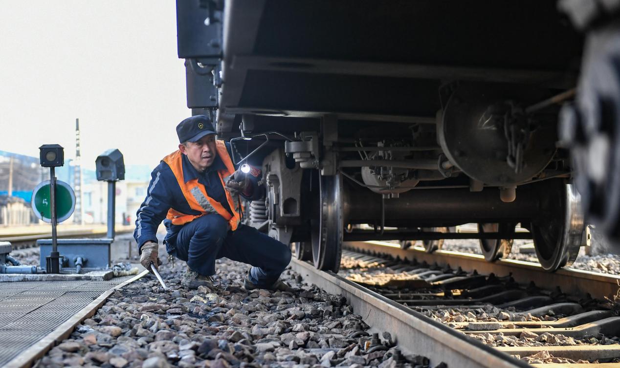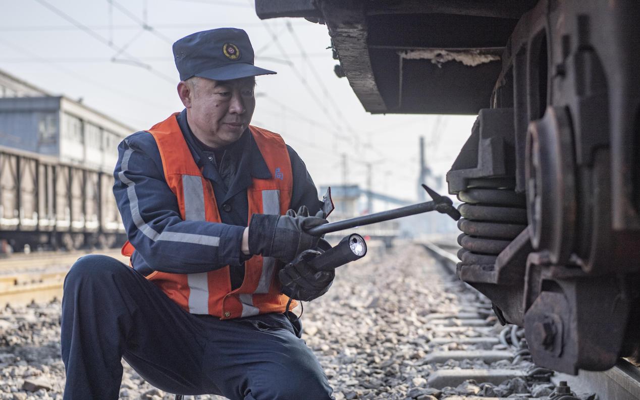 为确保电煤和物资运输,听音辨伤的检车员,每天通过“千锤百炼”来确保列车运行安全。春运期间,他们的工作量由日均检查6.7列增加至13.5列,比平时多出一倍。