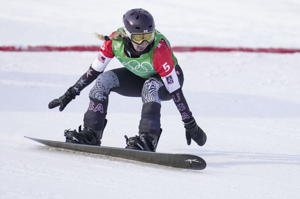 2月9日,获得冠军的美国选手琳赛·雅各贝利斯在单板滑雪女子障碍追逐决赛中冲过终点。新华社记者胡虎虎摄