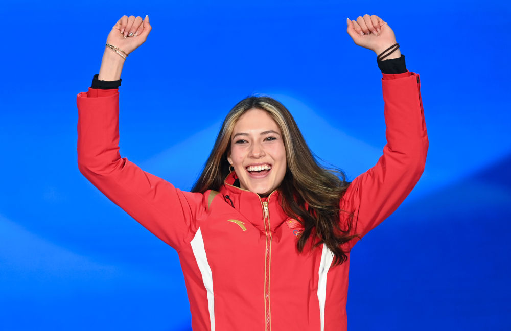 2月8日,中国选手谷爱凌在北京2022年冬奥会自由式滑雪女子大跳台奖牌颁发仪式上。新华社记者黄宗治摄