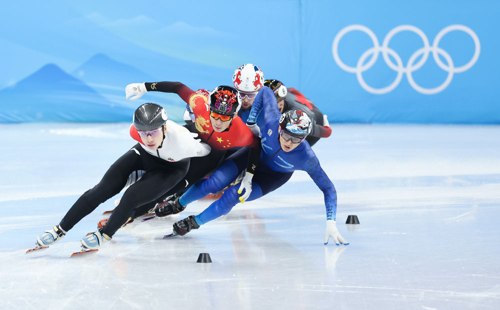 2月9日,中国选手任子威(左二)在北京2022年冬奥会短道速滑项目男子1500米半决赛中。新华社记者兰红光摄