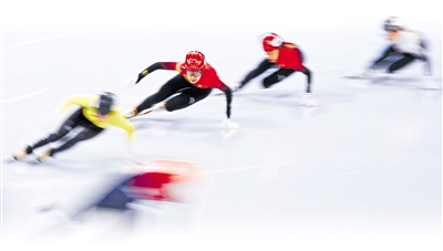 2月7日,中国选手曲春雨(中)在半决赛中。当日,短道速滑项目女子500米比赛在首都体育馆进行。新华社记者 李 尕摄