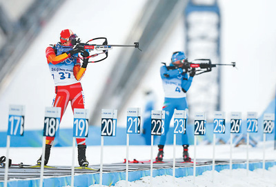 2月7日,中国选手唐佳琳(左)在比赛中射击。当日,冬季两项女子15公里个人赛在国家冬季两项中心进行。新华社记者 彭子洋摄