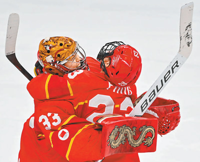 2月6日,中国队守门员周嘉鹰(左)赛后和队友拥抱庆祝胜利。当日,女子冰球小组赛在五棵松体育中心进行。新华社记者 李 然摄