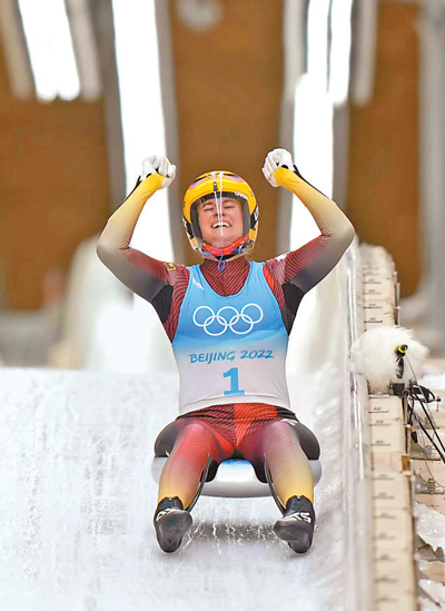 2月8日,德国选手娜塔莉·盖森伯格在女子单人雪橇比赛中以3分53秒454的成绩获得金牌。本报记者 伊 霄摄