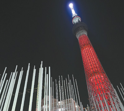 2月4日,日本东京的“天空树”为北京冬奥会点亮特别灯光。