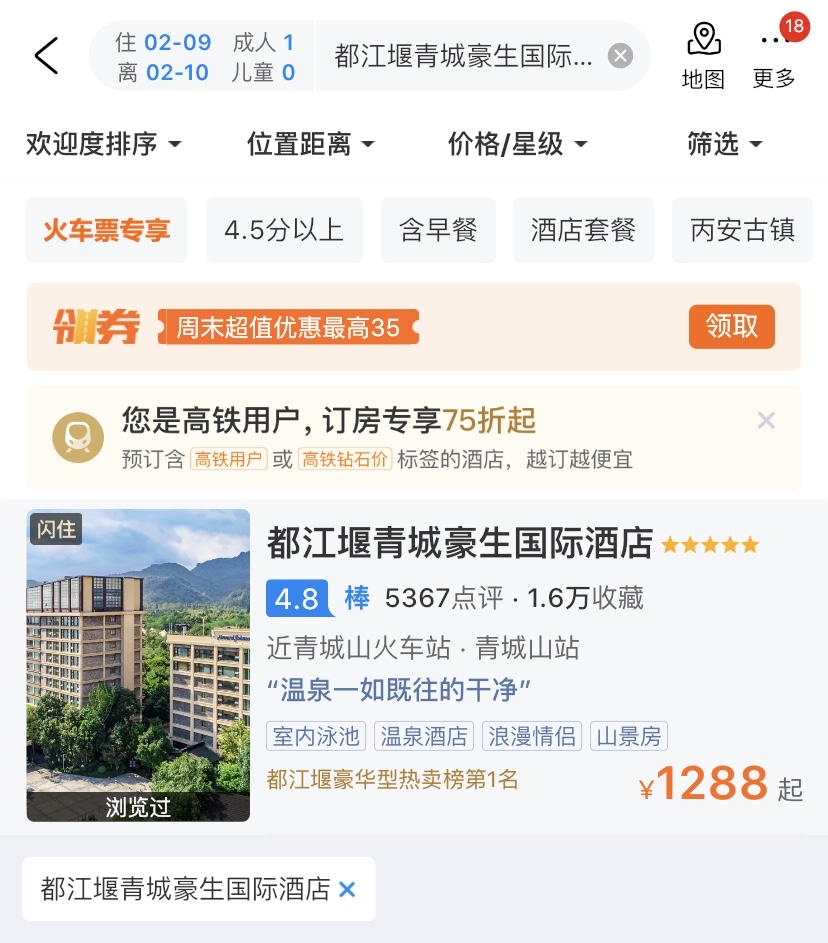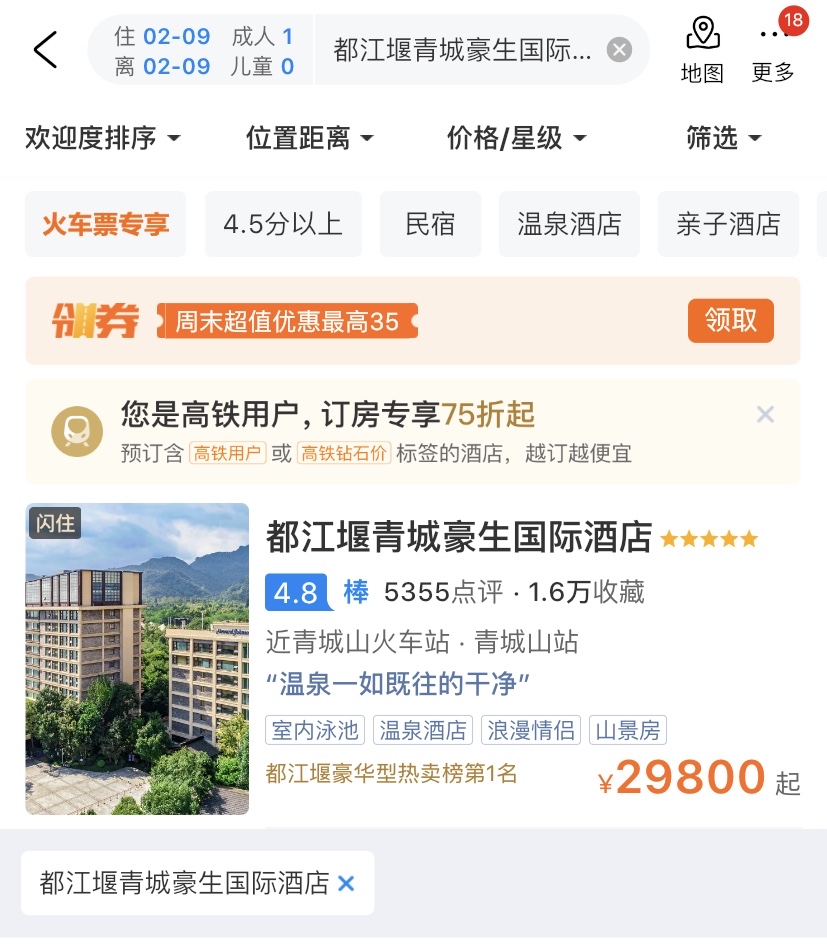 红星新闻记者了解到,市民所指的“天价酒店”是位于成都都江堰的青城豪生国际酒店。2月8日晚,记者在携程输入该酒店名称进行搜索时,也显示该酒店房价为“29800元起”。