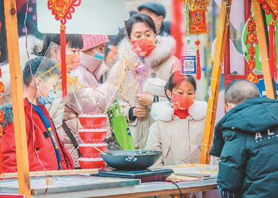 2021年,湖北省经济增速领跑全国,成绩亮眼。图为春节期间,游客在武汉武昌楚河汉街观看糖画。