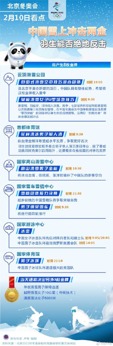 【#冬奥会10日看点#】北京冬奥会将在10日决出8枚金牌,中国军团有望在其中的两个雪上项目中冲金,分别是自由式滑雪空中技巧混合团体和单板滑雪女子U型场地技巧。花样滑冰赛场将决出男子单人滑金牌。此外,中国选手徐铭甫、张洋铭将出战高山滑雪男子全能。当天另外三枚金牌将在单板滑雪男子障碍追逐、越野滑雪女子10公里(传统技术)、速度滑冰女子5000米中产生。
