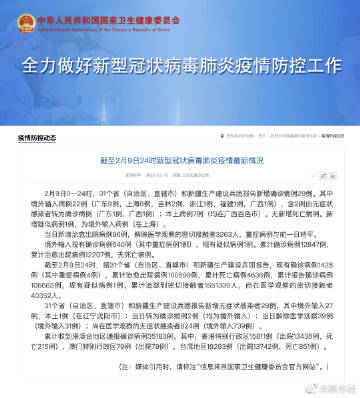 截至2月9日24时,据31个省(自治区、直辖市)和新疆生产建设兵团报告,现有确诊病例1428例(其中重症病例4例),累计治愈出院病例100599例,累计死亡病例4636例,累计报告确诊病例106663例,现有疑似病例1例。累计追踪到密切接触者1551339人,尚在医学观察的密切接触者40352人。