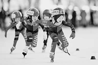 小朋友在2022呼和浩特青少年体育俱乐部滑冰联赛中参加速度滑冰比赛。王正摄/光明图片