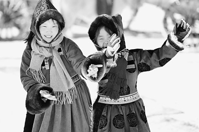 两名小朋友在那达慕浩特举办的冰雪那达慕活动中参与实景演出。新华社发