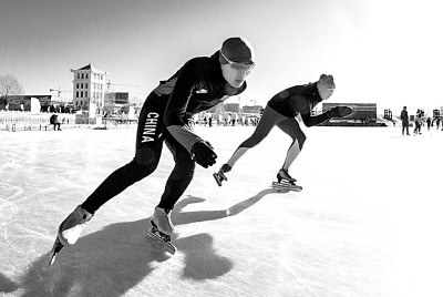速滑爱好者在内蒙古呼和浩特市东河冰雪场练习速度滑冰。丁根厚摄/光明图片