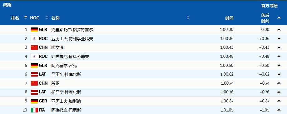 北京冬奥会男子钢架雪车第一轮滑行刚刚结束,中国选手闫文港以1分00秒43的成绩暂列第三位,德国选手格罗特尔以1分00秒整的成绩排名首位。另一位中国选手殷正以1分00秒74的成绩排名第七,并创造了4秒60的赛道出发纪录。稍后还将进行第二轮的滑行。