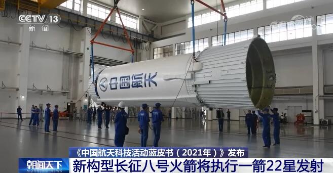 记者从《中国航天科技活动蓝皮书(2021年)》发布会上了解到,我国新一代中型运载火箭长征八号目前正在海南文昌发射场进行发射前的测试工作。此次发射的长征八号采用了全新的构型,将一次发射22颗卫星。