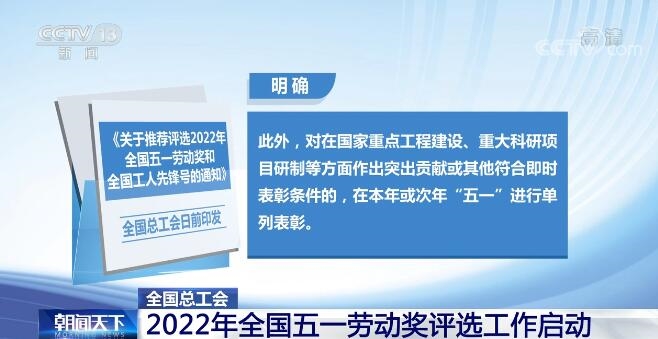 央视网消息:全国总工会日前印发通知,决定在2022年“五一”前夕表彰一批先进集体和先进职工,分别授予全国五一劳动奖和全国工人先锋号荣誉称号。