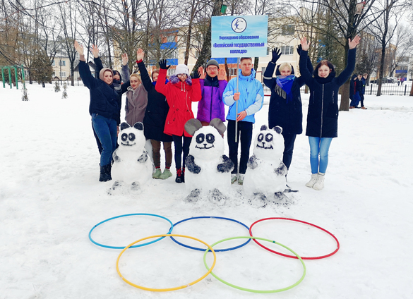 维莱卡州立学院的学生们还在冰墩墩雪人前,用呼啦圈摆放了一个五环标志。学生们手持冰刀、雪仗、雪板与冰墩墩合影,以此支持白俄罗斯运动员。