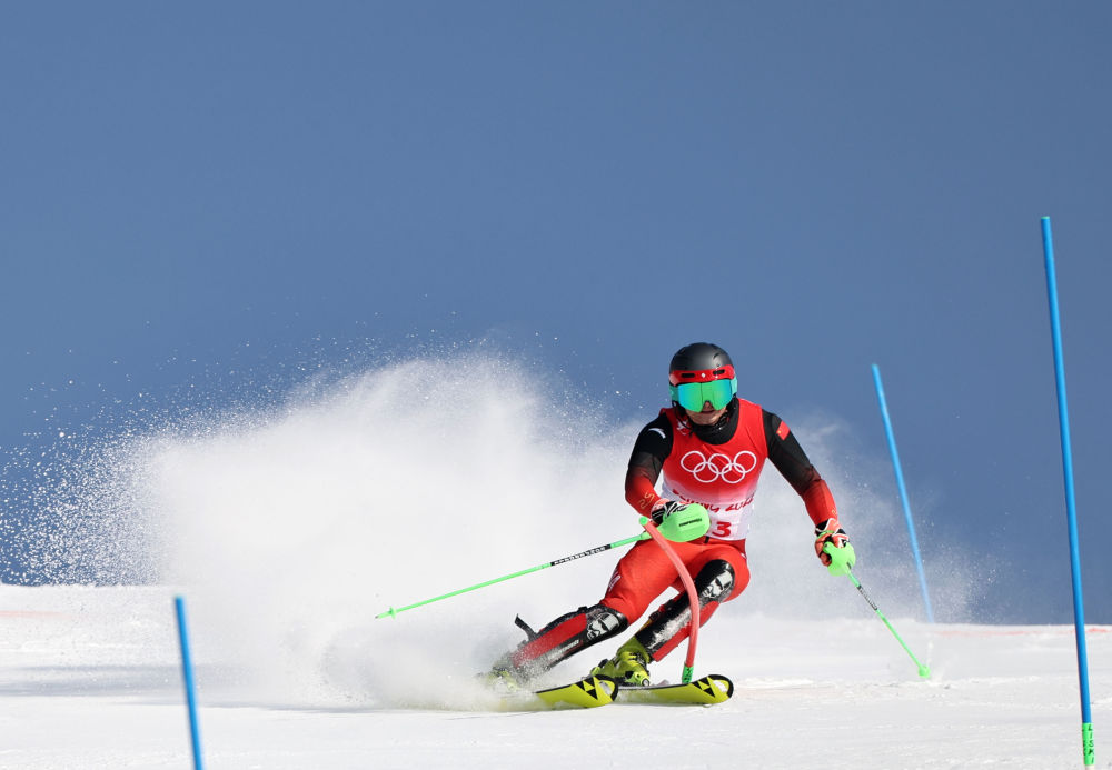 2月10日,中国选手张洋铭在北京冬奥会高山滑雪男子全能比赛中。新华社记者陈斌摄