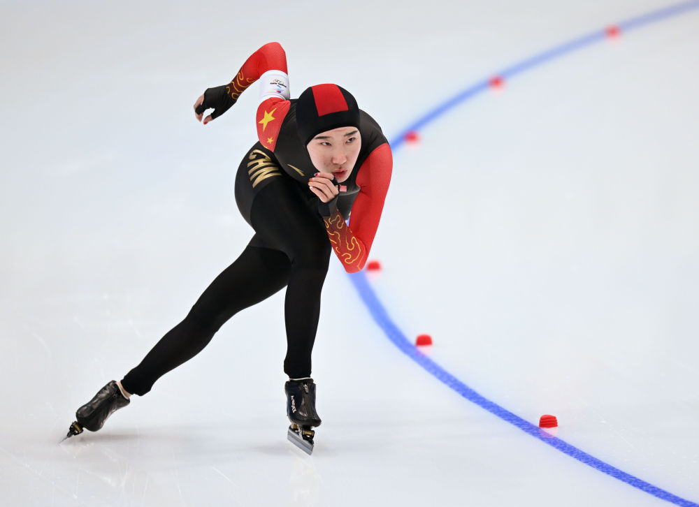 2月10日,中国选手韩梅在北京冬奥会速度滑冰女子5000米比赛中。新华社记者武巍摄
