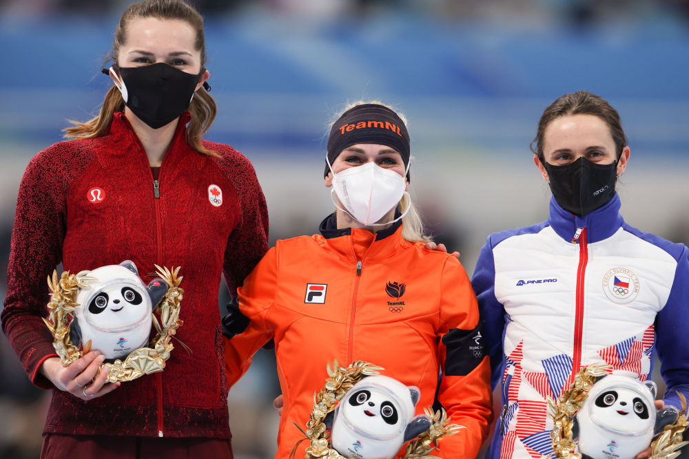 2月10日,北京2022年冬奥会速度滑冰女子5000米比赛冠军荷兰选手伊雷妮·斯豪滕(中)、亚军加拿大选手伊莎贝尔·韦德曼(左)与季军捷克选手马丁娜·萨布利科娃在颁发纪念品仪式上。新华社记者程婷婷摄