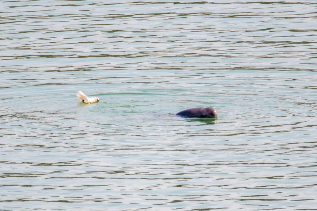 9日中午12时,杨河、杨治吉等江豚摄影师像往常一样在江南点军葛洲坝下拍摄江豚。突然杨河看到江面情况有点不对劲:在葛洲坝一号船闸下游航道,一只江豚游动时背后跟着两个塑料瓶,不停地沉浮。