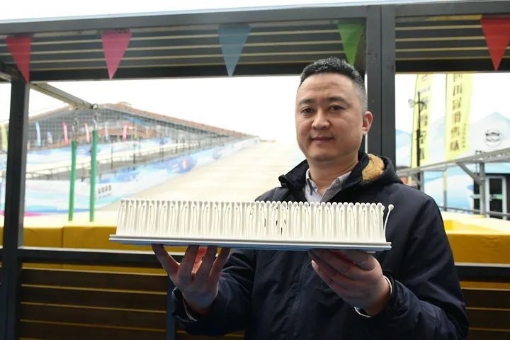 “于是尖锋就想,我们怎么不自己造一个舒适的呢?从功能出发,顶端设计成球型,不扎人,为弥补国外材料短、回弹空间小的弊端,再把颈部加长,经过调整,功能完全能够满足需要。结果一看咋这么像我们四川人烫火锅的金针菇?”张魏说,这套“金针菇”式旱雪滑道组合单元2012年获得了国家专利。