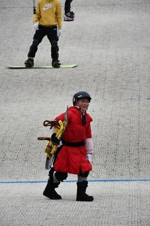 完成约2小时骑行道双板练习后,8岁女孩杜艾诺勇敢来到初级道。她纵身一滑,很快就掌握了技巧,身体前倾左右摆动,像一只灵动的小鸟。