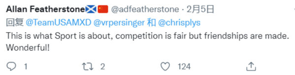 “很荣幸收到这些美丽的北京冬奥会徽章,我们的中国同行表现出了极佳的体育精神。”赛后美国冰壶混双队在其社交平台发出普利斯、珀辛格展示纪念徽章的画面。